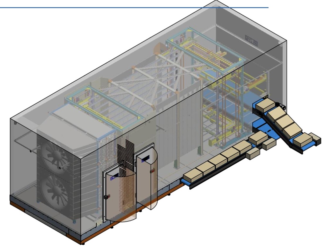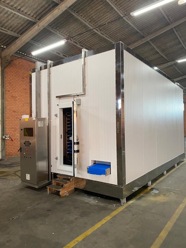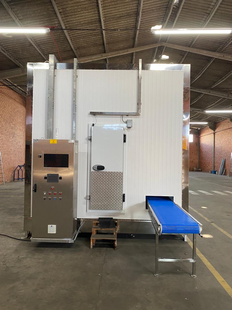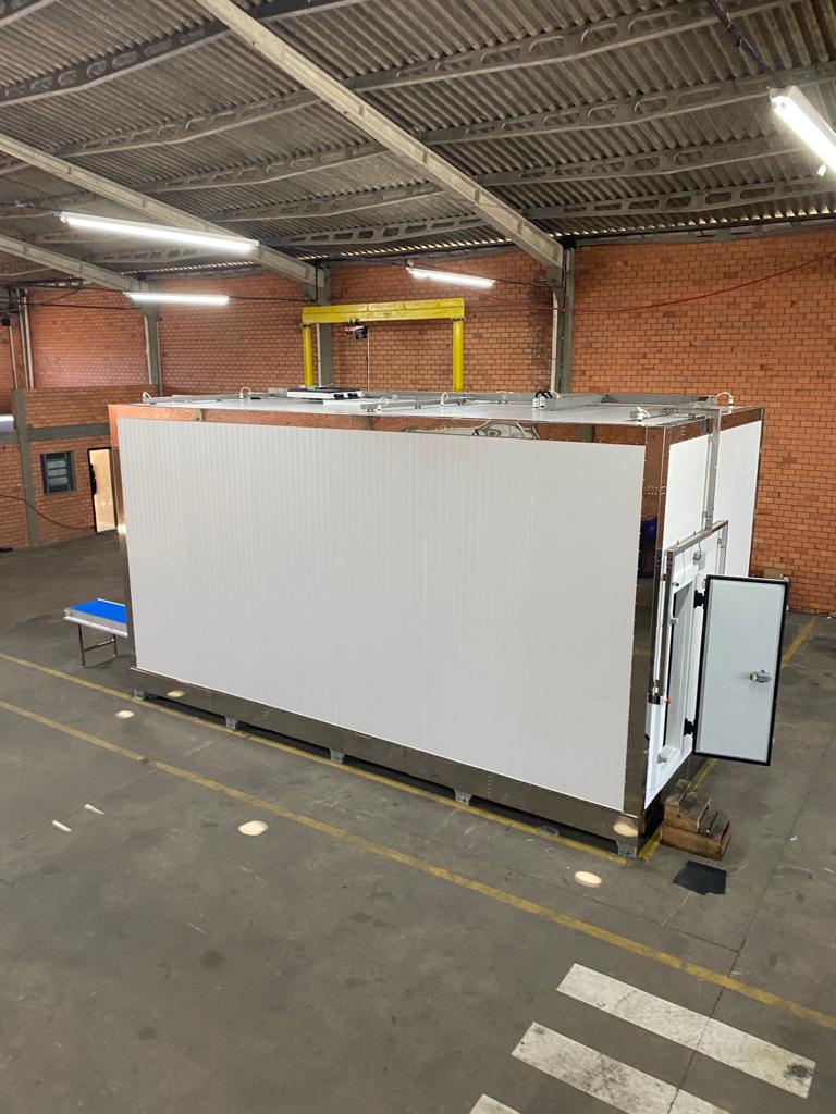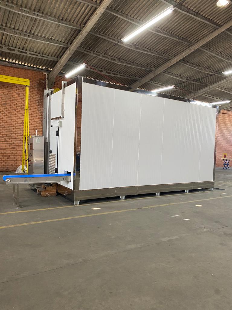 Sua estrutura reúne componentes de alto padrão, como acabamento interno em aço inox, piso antiderrapante com drenos, esteiras configuráveis conforme a necessidade do cliente, evaporadores de tecnologia industrial, ventiladores de alta performance, isolamento térmico em PUR ou PIR e sistema elétrico com inversores de frequência e quadro em inox, garantindo resistência, confiabilidade e performance no processo.